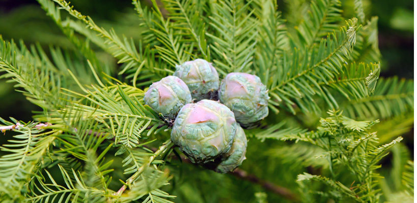 Bald cypress have scale-like or needle-like leaves that resemble conifer foliage. They also have flat or peltate cone scales, with each scale producing 2 to 9 seeds. These trees grow in moist areas, commonly in swamps and wetlands.